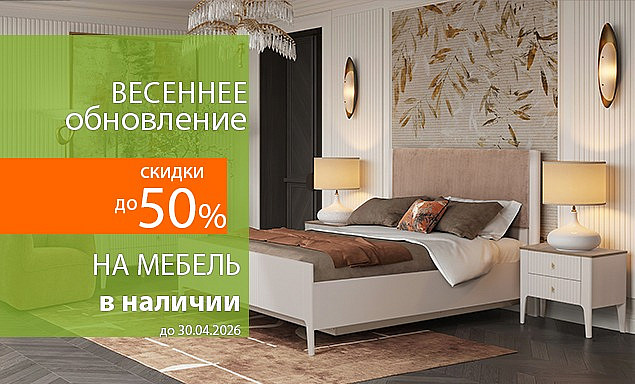 Мы сделали весну щедрой: максимальная выгода ждет вас на самые популярные позиции. Не ждать, а обновлять — вот наш девиз. Только то, что есть в наличии. Никаких ожиданий «под заказ» по 2-3 месяца. Забирайте любимый диван или спальню уже сегодня по сниженной цене. Привезем и расставим в удобное время.